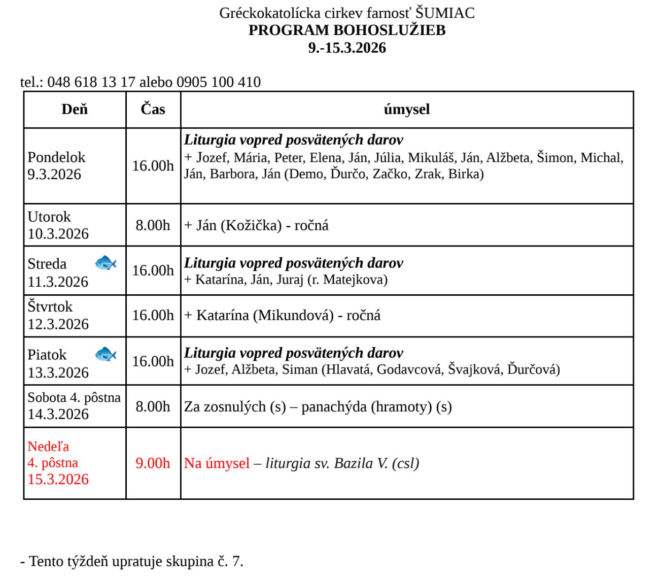 z ročnej liturgie +Márie Dudášovej 50,-€; z ročnej liturgie +Jána Gordana 150,-€. PBZ. - Tento týždeň upratuje skupina č. 6.